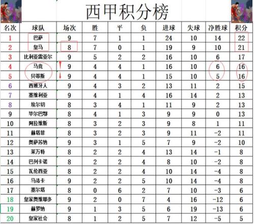 积分榜方面,最后压哨绝杀赢球后,先赛的巴萨暂时以1分优势超过皇马夺回榜首,皇马跌到第2。马竞今天赢球后,近8轮4胜4平保持不败,以1个净胜球的优势超过贝蒂斯挤入前4,落后榜首的巴萨6分。