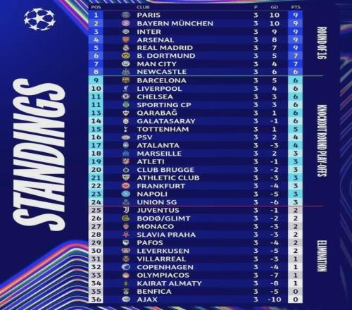 欧冠3轮比赛之后,大巴黎、拜仁、国米、阿森纳、皇马,均以3战全胜领跑。
