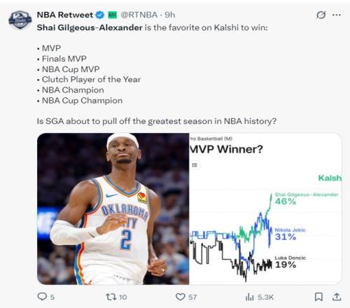 根据数据媒体的预测,亚历山大本赛季有希望同时拿到MVP、总决赛MVP、NBA杯MVP、最佳关键球员、NBA总冠军、NBA杯冠军。