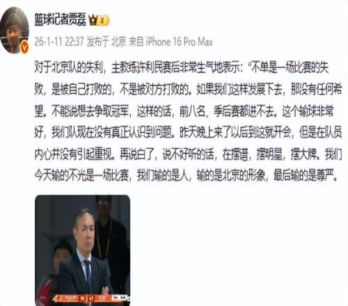志在冲冠的北京队今晚又输球了,他们在客场以110比118输给了深圳队,遭遇两连败,北京球迷和媒体人感到非常失望。而主帅许利民却感到非常的震怒。